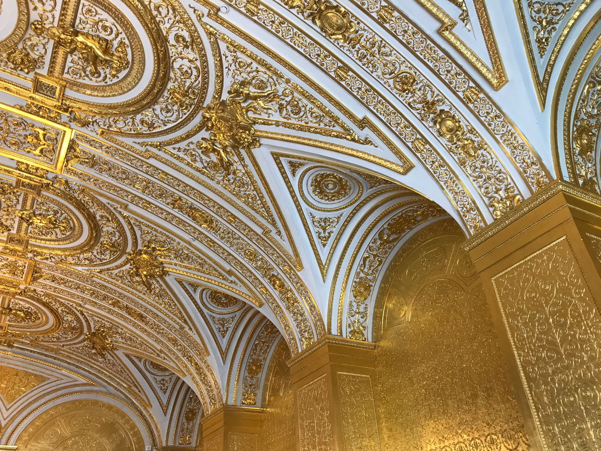 And I wasn't disappointed. The first floor and the Western European half of the second floor feature beautiful galleries, but the Russian half of the second floor is hosted on the tsar's old residences, which are nothing short of spectacular. There are reception halls, banquet halls, offices, ballrooms, a wood-panelled library, drawing rooms... all of them very different to each other but all exquisite in their own way. Some rooms were almost entirely covered in gold (and I thought Peterhof was already very golden), whereas others were fully white, and others still painted all over with raphaelite frescoes. There's a Malachite Hall with green columns and vases, a throne room, a grandiose golden chapel, and everywhere you look the ceilings are decorated with paintings or intricate mouldings.
